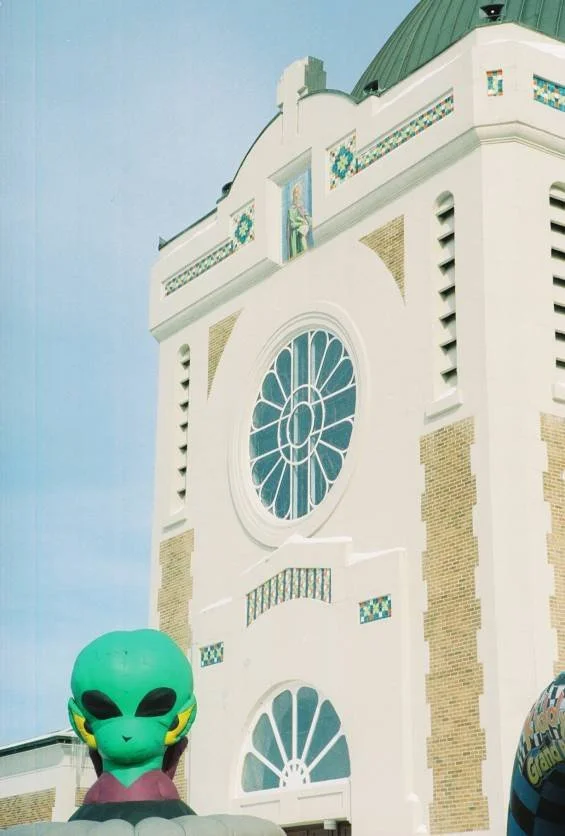 A curious contrast: 1920's Catholic Cathedral and mammoth inflatable green alien kid-bouncing attractions…