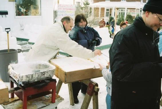 One interesting attraction at the festival was the booth were yellow snow eating was encouraged - boiled maple syrup is poured into the snow, were it solidifies quickly into a wonderful tasting filling-removing adhesive (the local dentist was on hand to clean out wallets).
