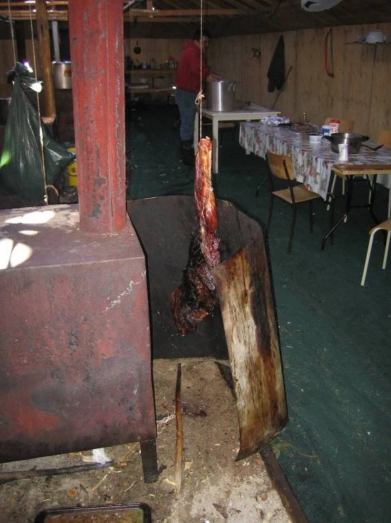 Despite the large, full-length opening in the roof peak and lack of insulation, this shack was easily 65 degrees inside. An adjacent room (unheated) made a perfect freezer to keep the meat awaiting their turn at the fire. We had missed lunch, but many weren't very hungry at this point, after nearly losing our lives, despite the wonderful smells from the cook shack.