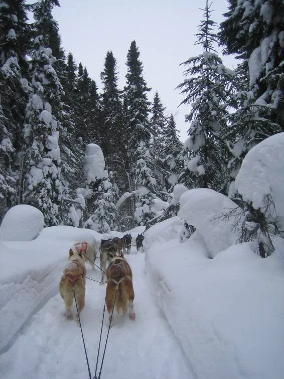 Day 8: Breakfast, then, shortly thereafter, we were picked up by Christian, our dog sledding guide, at the hotel Chibougamau. We followed him to his camp, where we were drowned in the sound of barking, howling dogs. Yep. This is the place. A brief tutorial, punctuated by "VERY IMPORTANT" several times in a rough French accent had us ready to tame the savage beasts. The view really is the same unless you're the lead dog. Actually, it was a quite nice- impossibly deep snow load supported by spindly Black Pine trees- reminiscent of an M. C. Escher painting. Within minutes of departure, the lead group lost the rest of the crew, reminiscent of a Monty Python skit. Holding back the eager dogs was a challenge, but no show. In the bush there is only one way out –forward.