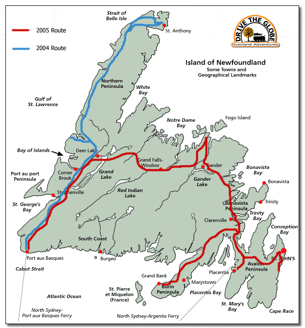 Map of Newfoundland with 2004 & 2005 Routes